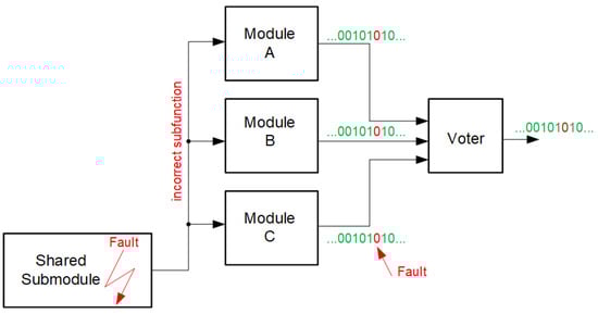 It is often the case that synthesis tools, in the process of optimising a circuit in terms of the number of blocks, realise the sharing of logic resources between selected logic functions. The common parts (the subfunction) of several selected functions are only realised once in a single shared subcircuit. Then, the result of this subfunction is delivered to the selected functions. From the point of view of reducing the number of logic blocks and power, this is an advantageous phenomenon (a given section of the circuit can be realised only once, rather than several times for the selected functions separately). Unfortunately, from the point of view of TMR mitigation, it is a very unfavourable phenomenon. The individual circuits attached to the voter should not have parts in common. Let us imagine a situation in which individual modules A, B and C have a part of the circuit in common, implementing a specific subfunction. If an error occurs in this part of the circuit, the error will be propagated through all three modules in exactly the same way. This means that the voter will not detect any differences in its inputs and will not correct the error. Such a case is shown in Figure 5. Thus, it can be seen that optimising the implementation in terms of the number of resources can, in some cases, lead to a degradation of the mitigation properties of the circuit.