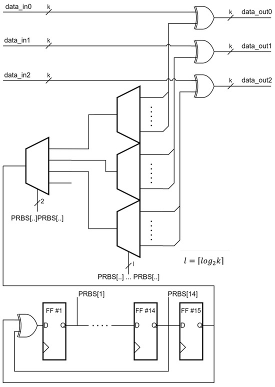 There are various forms and possibilities for building such an error-sequence generator. One solution may be to use a module that generates a Pseudo-Random Bit Sequence (PRBS). To generate the PRBS, a shift register with feedback implemented by an XOR-type logic gate is usually used. Each shift register is associated with some polynomial over a finite body. The maximum length is for shifting registers associated with primitive (non-decomposable) polynomials over the body. Such registers include the polynomial , which is associated with the sequence denoted PRBS15. It uses a 15-bit ring register and involves combinations (32,767 combinations). Since the polynomial is prime, the number of states includes all but zero. The micro-architecture of the error injector using the XOR function and the PRBS15 module is shown in Figure 7. When PRBS[15] returns a high state, the data bits are negated and thus an error is injected into the data stream.