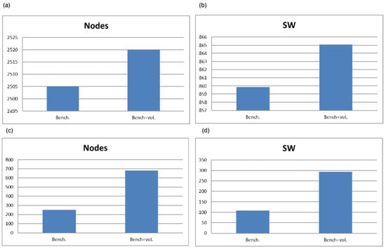 Summary results of the synthesis in ABC: for combinational circuits, number of logic network vertices (a) and value (b); for sequential circuits, number of logic network vertices (c) and value (d).
