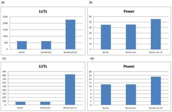 Looking at the graphs in Figure 11a,b, it can be seen that the results obtained are practically the same regardless of whether triple redundancy was implemented or not. The expected result is a situation where the number of blocks and the dynamic power will be about three times higher in the approach where there is TMR (Bench.+Vot.) than for the approach without TMR (Bench.). Such a relationship can be observed for sequential systems. For the number of blocks (Figure 11c), the growth of the logic structure due to the implementation of TMR is 2.73 times. In the case of power, on the other hand, it is 2.71 times. Looking at combinational circuits, it can be seen that the expected redundancy was removed in the optimisation process during the synthesis process. In this situation, the question of methods for describing mitigating systems remains open. In the case of sequential circuits, the relationship between the number of blocks in the cases is less than three, indicating that the synthesis process was carried out in such a way that there must be resource sharing between the individual modules attached to the voter inputs. Given the nature of TMR, it is an open question whether this is a beneficial phenomenon. The relationship in Figure 11d directly reflects the relationship of the number of resources used, so it is difficult to speak of power optimisation.