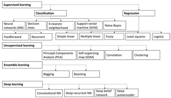 PAs are powerful analytic techniques for dealing with data. The goal of the application of PAs is to learn from the data, to achieve the prediction of a certain phenomenon [] by applying algorithms in ML. For production time estimation in research and industry PAs of Supervised Learning (SL), Unsupervised Learning (UL), Ensembled Learning (EL), and Deep Learning (DL) are applied. These are summarized in Figure 1. PAs are used in the sense of building a model for estimation that depends on attributes. Attributes are mostly described by time or specific data.