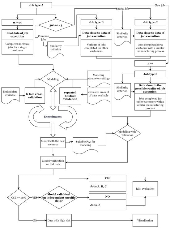 For type C and D jobs, the methodology could not be verified. The information strength of the data obtained from the systems is not sufficient to define the criterion of similarity of C and D jobs. In order to define the similarity criterion, it is necessary to go through the job specifications and technical drawings with the participation of an expert with in-depth knowledge of the company’s products. This was not possible due to time constraints. However, the application of the method of creating the model for types C and D jobs is analogous to the presented creation for models of types A and B jobs. For type D jobs, implementing data augmentation techniques seems to make sense.