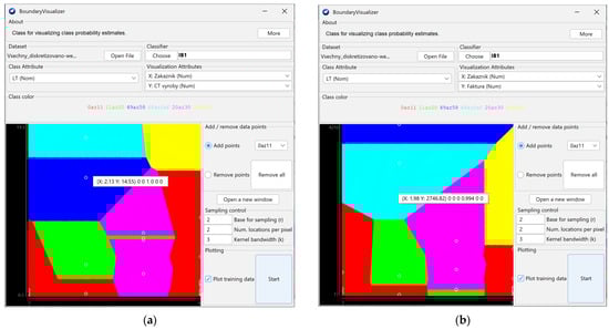 During experimentation, models are trained by applying different PAs to data samples. The training data affects the modeling results. Modeling errors can occur during experiments. Underfitting is a model error that occurs when attributes are selected that are too general or when an inappropriate PA algorithm is chosen, while overfitting is a model error that occurs when attributes have been selected for a particular special event [,]. Noise in the data can lead to overfitting. Modeling underfitting errors are eliminated by selecting different attributes or by selecting a more appropriate PA. Further training data distinguishability affects the model building. PAs, as decision trees, find more boundaries between classes, therefore they are suitable for data with high separability. For linearly separable data, SVM can be used to find the boundary between two classes. For data with low variability, PAs with lazy algorithms or simple rules that find one class are suitable. Data and model dependencies for different PAs are discussed in [,,,].