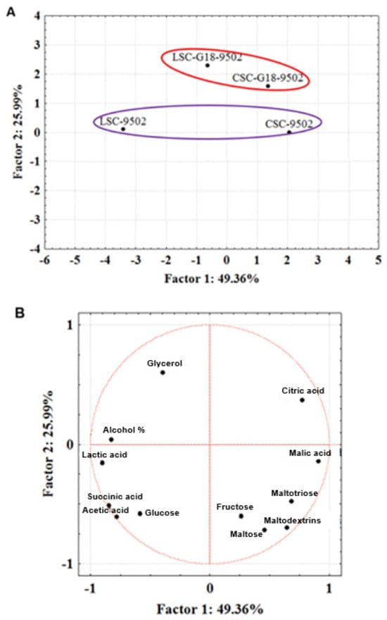Biplot of scores (A) and loadings (B) obtained with the application of PCA to alcohol, organic acid, and sugar contents along the first and second component.