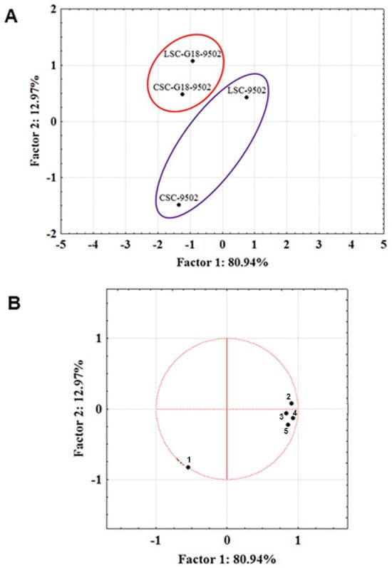 According to this analysis (Figure 2), Factors 1 and 2 explained nearly 94% of the total variance. The comparative analysis of Figure 2A,B indicated that the volatile profile of CSC-9502 beers was characterized by the highest hydrocarbon content. The other beer samples exhibited profiles not dominated by specific classes of compounds.
