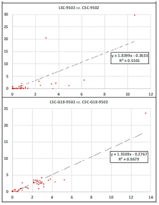 The two production levels were compared by linear regression further to confirm our findings. Since linear regression analysis has been used in comparison studies [], it was applied to all the analytical results to detect any bias concerning the industrial-level reproducibility of the laboratory-level designed process. The analysis produced the following R values (p < 0.05): 0.932 for the regression analysis applied to LSC-G18-9502 and CSC-G18-9502 and 0.742 for that applied to LSC-9502 and CSC-9502 overall dataset. (Figure 3).