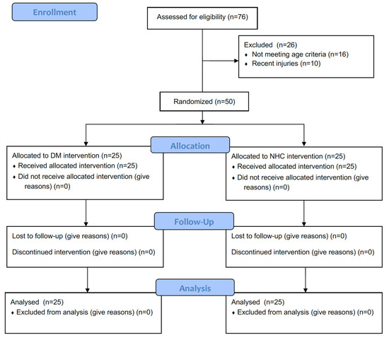 Recruitment was carried out at the Varsovia Football Academy within the Central Junior League, employing convenience sampling. A total of 76 potential participants were initially identified and screened against eligibility criteria, which included: (i) age between 13 and 15 years old, actively engaged in soccer practice; (ii) absence of lower limb and lumbar spine surgery or injuries within the last 6 months (hip, knee, ankle), no current pain in the hip, knee, or ankle joints, no hypermobility of the lower limb joints, and no history of neurological or connective tissue disorders; and (iii) availability for both assessment time-points. Following the exclusion of 16 participants for not meeting the age criteria and 10 for recent injuries within the last month, a total of 50 participants remained eligible for random assignment to study groups (Figure 1).