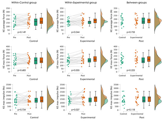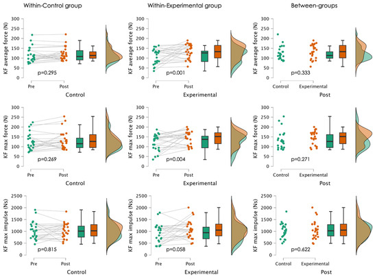 Analysis within the experimental group (post–pre) showed significant differences in KF maximal force (24.2 N; p = 0.004), KF average force (23.4 N; p = 0.001), KE maximal force (25.8 N; p = 0.005), KE average force (20.0 N; p = 0.044), and KE maximal impulse (265.9 Ns; p = 0.027), although no significant differences were found in KF maximal impulse (150.1 Ns; p = 0.058).