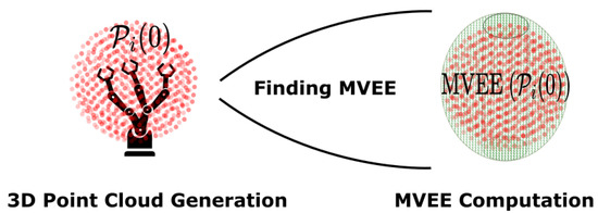 Algorithm 1 summarizes the computations needed for the pre-processing stage. As depicted by Figure 4, Algorithm 1 generates a 3D point cloud and an MVEE for each of the robotic arms. To prevent unnecessary computations, the if conditional in Algorithm 1 ensures that the point cloud rendering and ellipsoid fitting computations are performed only for robotic arms having different kinematic parameters. For instance, if there are six ABB IRB 4600 robots, since their point clouds , and corresponding fitted ellipsoids , are the same, the rendering/fitting computations in the for loop are only run for the first robot.