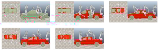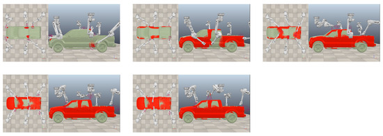 The collection of simulation results considered six robotic arms of different types, namely, four ABB IRB 4600 and two Fanuc R2000iC robots. Figure 14 depicts the snapshots of the heterogeneous team of robots painting the Ford Motor Company F-150 truck where the robot base positions were obtained from our proposed optimal base placement algorithm. Furthermore, Figure 15 depicts the snapshots of the same team placed at non-optimal positions. The figures demonstrate that in the non-optimal case, the robots failed to paint the top of the vehicle completely, despite the fact that both painting scenarios were utilizing the same motion planning algorithm. Furthermore, suboptimal base positions forced the robots to traverse configurations close to elbow and shoulder singularities during painting, which can be clearly seen when the arms have to overstretch to perform their painting task.