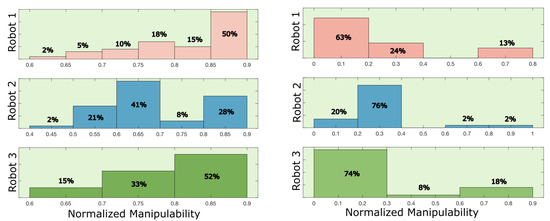 The normalized manipulability of the robotic arms during collaborative vehicle painting: (left) optimal and (right) non-optimal base positions. The percentage values on each bar in the histograms provide the painting duration during which the robot manipulability belonged to a certain interval. In particular, a percentage value of on a bar located in the interval for the ith robot, , indicates that the robot had a normalized manipulability value belonging to the interval during of the painting task duration.