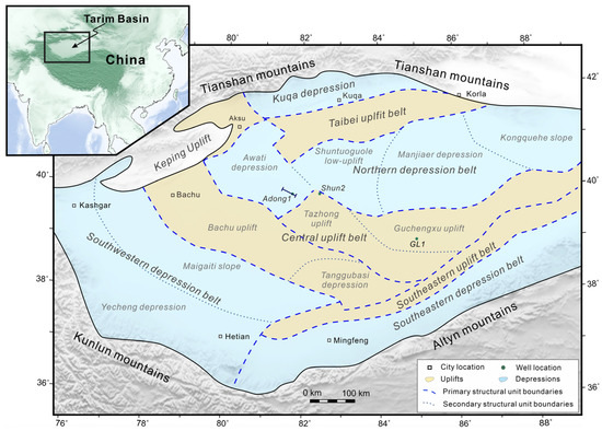 The study area lies in the central part of the Tarim Basin, a large basin located in the northwestern part of China (Figure 2) [23]. The basin formed in response to continental breakup of the Rodinia supercontinent [24]. After its initial formation, it generally turned into a cratonic basin from the Cambrian to Permian periods and converted to a foreland basin since the Triassic [24,25]. It received sediments almost continuously from the Paleozoic to the Cenozoic with a residual thickness of up to 15,000 m. The Cambrian to Middle Ordovician strata mainly consist of dolomites and limestone, and the upper Ordovician to Cenozoic units are predominantly siltstone, mudstone, and sandstone [22]. Extensive magmatic activity occurred within the Tarim basin during the Permian period [26]. The residual flood basalts revealed by seismic profiles and borehole data cover the central and western part of the Tarim Basin with an area of about 250,000 km2; the accumulated thickness of the basalts is up to 780 m [27]. This magmatic activity is called the Tarim Permian Large Igneous Province (LIP) [28,29].