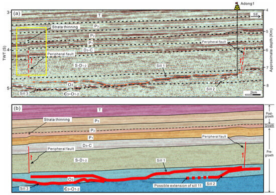 (a) Semi-interpreted and (b) interpreted seismic profiles showing sill intrusions and peripheral faults in the central part of the Tarim Basin (for location, see Figure 2) after [18,22]. T, P3, P2, P1, D3-C, S-D1–2, O3, Є-O1–2 are the strata symbols of structural units. T—Triassic strata; P3—Upper Permian strata; P2—Middle Permian strata; P1—Lower Permian strata; D3-C—Upper Devonian to Carboniferous strata; S-D1–2—Silurian to Middle Devonian strata; O3—Upper Ordovician strata; Є-O1–2—Upper Cambrian to Middle Devonian strata. The seismic profile in the yellow box is used for time–depth conversion. The growth strata depicted here represent the strata deposited during the uplift. Pre-growth strata and post-growth strata refer to the layers formed before and after this stage, respectively (see text for details).