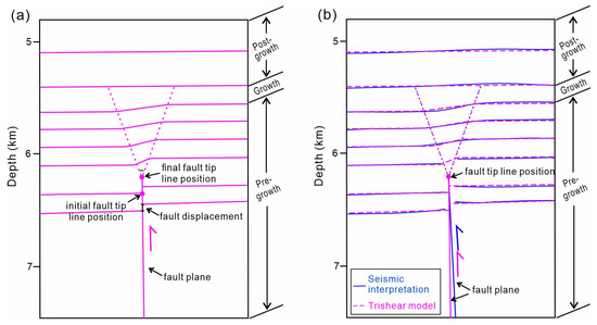 (a) Structural pattern of the peripheral fault derived from the trishear kinematic model. (b) Structural pattern of the peripheral fault derived from seismic interpretation versus that from the trishear kinematic model. Pre-growth, growth, and post-growth are defined based on the relative sequence of deposition and uplifting (see text or Figure 3 for details).
