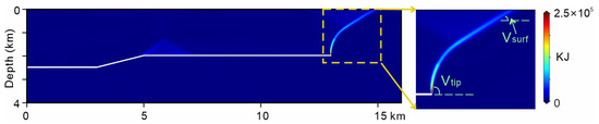 Shear dissipation map that predicts the damage distribution of the model. The white lines are the modeled sill. The energy dissipation by shear damage is represented by the color scale in kJ. Vtip and Vsurf are measured at the sill tip and at the surface, respectively.