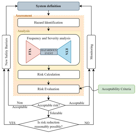 Berrado et al. [17] made further advancements by presenting an RM framework based on historical databases, also employing FTA and ETA. This framework demonstrated its utility in social and economic evaluations through cost–benefit analysis (CBA). It allows for risk assessment based on historical data, categorizing risk by frequency and consequences in a risk matrix, thus providing qualitative safety insights derived from quantitative data.