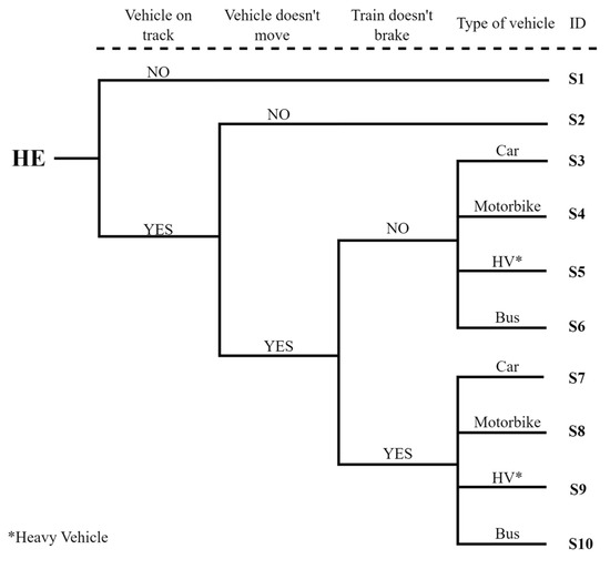 ETA is a bottom-up methodology that, starting from the HE, combines the probabilities that further subsequent events will occur or not, influencing each step both the extent of the consequences and the probability of their occurrence, describing all the possible final accidental scenarios [27]. Also, ETA has found application in the railway sector for the qualitative and quantitative analysis of the accident consequences, usually applied after FTA in a bow-tie structure [17,38,39].