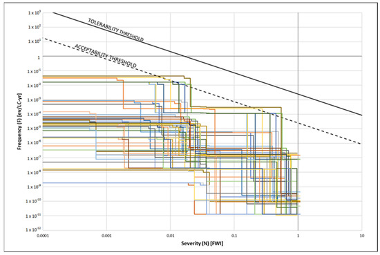 Those indicators, in the risk evaluation phase, are compared with criteria and thresholds to assess their acceptability [31]. In particular, the risk level can result in acceptable, tolerable, or unacceptable. In the first case, the risk is low, no intervention is required, and only monitoring activities should be carried out [27,41]. In the second case, the level of risk is not entirely negligible, and the reasonability of implementing further barriers must be assessed. Finally, in the last case, the risk is too high, and the implementation of all necessary safety barriers is mandatory to restore the safety of the system.