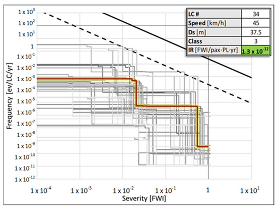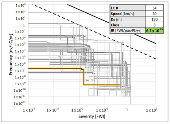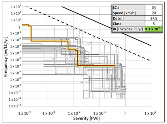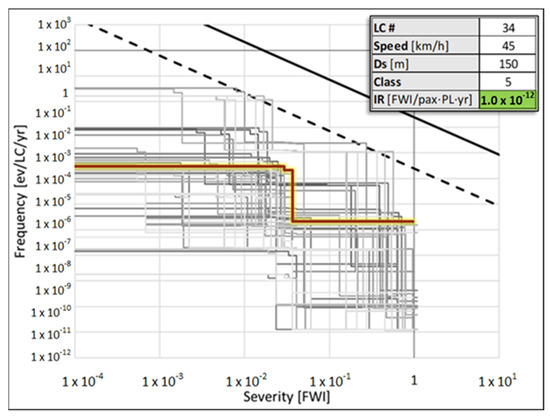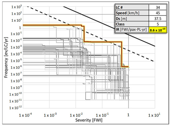 By holding other conditions constant, the risk analysis shows that a maximum train speed of 20 km/h would be sufficient to ensure safety at the LC. As demonstrated in Figure 11, reducing the speed lowers the frequency of accidents, shifting the risk curve and its associated consequences to the left, indicating a safer scenario.