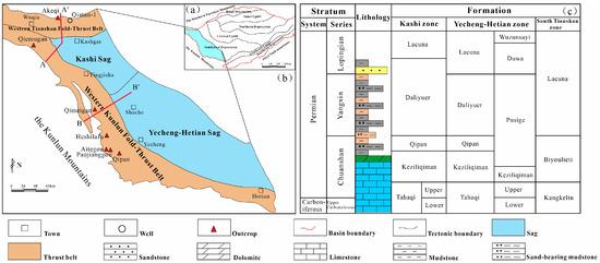 The study area was located in the southwestern part of the Tarim Basin in China. (a) Geological map of Tarim Basin and the (b) structural division of piedmont southwestern in Tarim Basin and (c) stratigraphic column in the study area (adapted from [22,25]).
