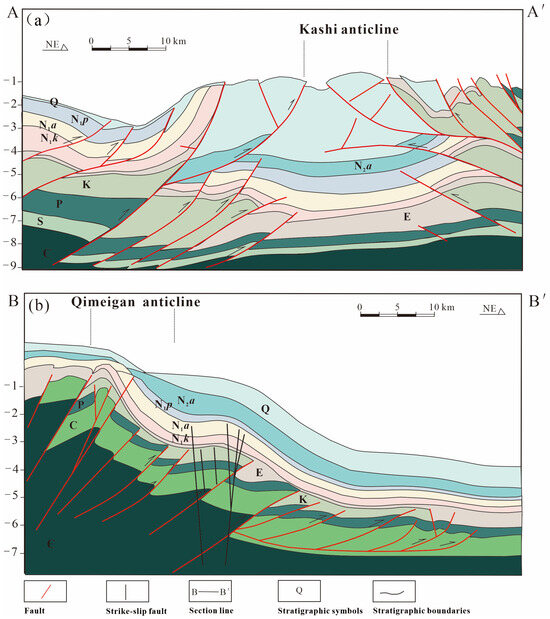 (a) NE-trending profile through Kashi anticline and (b) NE-trending profile through Qimeigan anticline showing the stratigraphic framework of piedmont southwestern in Tarim Basin.