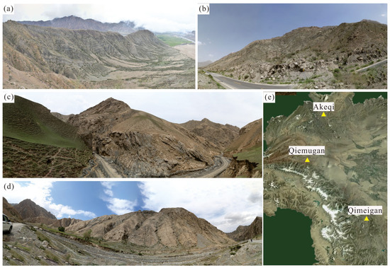 (a) Outcrop exposures of the Permian Qipan Formation in Qiemugan section. (b) Outcrop exposures of the Akeqi section. (c,d) Outcrop exposures of the Qimeigan section. (e) Satellite map showing the lateral trace of outcrop sections of piedmont southwestern in the Tarim Basin.