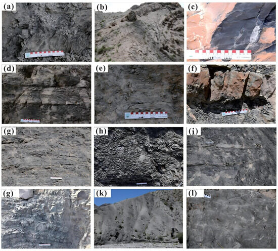 Figure 5. The images present the lithological characteristics of the hydrocarbon source rocks of the Permian Qipan Formation. (a) Dark gray mudstone in Qimeigan section. (b) Calcareous sandstone and mudstone in Qimeigan section. (c) Dark mudstone at the bottom of P1-2q in Qimeigan section. (d,e) Mudstone interbedded with siltstone at the top of the P1-2q in Qimeigan section. (f) Black mudstone thin layer mudstone crystal limestone in Qiemugan section. (g) Thin layer dark gray calcareous mudstone in Qiemugan section. (h) Gray green mudstone sandstone in Qiemugan section. (i) Black mudstone in Qiemugan section. (j) Dark gray mudstone in Qiemugan section. (k) Large scale dark mudstone in Akeqi section. (l) Bioclastic limestone in Akeqi section. - (2)