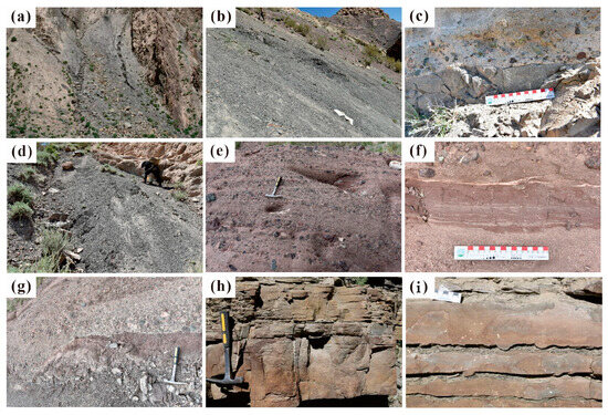 The images present the sedimentary characteristic of the Permian Qipan Formation. (a) Frontal delta mud in Qimeigan section. (b) Tributary bay in Qiemugan section. (c,d) Channel deposits in Qiemugan section. (e) Tabular cross-bedding in Qiemugan section. (f) Riverbed rhythmic sedimentation in Qiemugan section. (g) Riverbed retention and erosion surface in Qiemugan section. (h) Bouma sequence in Akeqi section. (i) Sandstone flute cast in Akeqi section.