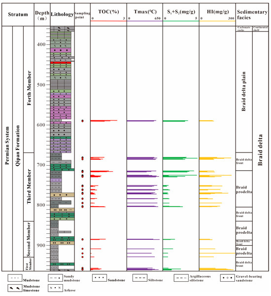 The thickness of the muddy hydrocarbon source rock in the Qiemugan section is approximately 63 m, and the lithology is predominantly black mudstone and bioclast calcareous mudstone. The sedimentary environment is characterized by transitional facies, with the transition from shelf to braided river delta front deposition (Figure 6).
