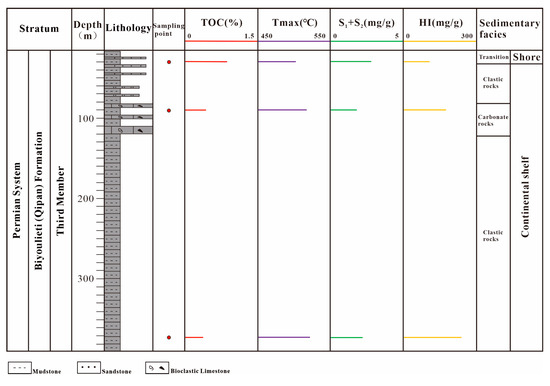 The sample of removed carbonate rock was repeatedly cleaned with deionized water until the hydrochloric acid was removed. Prior to analysis, the washed and dried samples were crushed to a particle size of less than 200 mesh, with each powder sample comprising 100 mg [30,31]. The TOC contents were conducted using the LECO CS-230 carbon-sulfur analyzer (LECO Corporation, St. Joseph, MI, USA). The Rock-Eval analysis was performed using OG-2000V (Horiba, Kyoto, Japan), which is an oil and gas display evaluator. This enabled the identification of the following parameters: total organic carbon (TOC), thermal maturity (Tmax), free hydrocarbon (S1), thermal pyrolysis hydrocarbon (S2), production index (PI), and hydrogen index (HI).