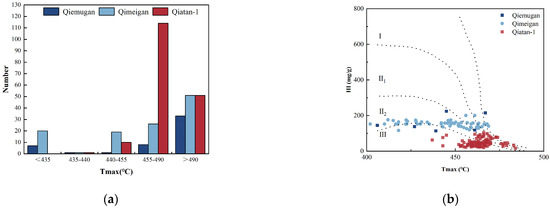 A clear correlation exists between the type of organic matter and the hydrogen index (HI), which allows for the classification of organic matter based on this index [31,44,45,47,48,49]. The identification of different kerogen types can be discerned through the examination of hydrogen index (HI) and oxygen index (OI) values within specific formations [45,47,49]. However, when the degree of thermal evolution of organic matter is high, the generation and excretion of hydrocarbons consume hydrogen and oxygen elements, leading to the loss of reference significance for HI-OI identification of organic matter types [50]. The type of kerogen determines the hydrocarbon production capacity and hydrocarbon products of organic matter [51]. The kerogen pyrolysis results indicate low values for the HI and the value of Tmax is excessive (Figure 9a). Following the removal of anomalies with excessive Tmax, the organic matter types present in P1-2q are predominantly Type III and Type II2, with a minor presence of Type II1 and Type I (Figure 9b). However, the hydrocarbon source rocks of P1-2q exhibit a high degree of thermal evolution and a shift in pyrolysis parameters, making it challenging to determine the kerogen type.