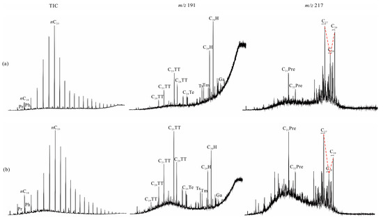 TIC, m/z 191, and m/z 217 mass chromatograms of the Permian Qipan Formation in the piedmont southwestern Tarim Basin. (a) Sample from Qiemugan outcrop section; (b) sample from Qimeigan outcrop section.