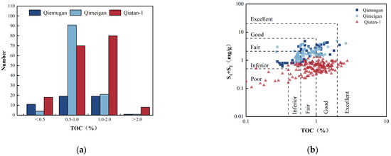 The evaluation of hydrocarbon source rocks is dependent upon three key factors: organic matter abundance, kerogen type, and organic matter thermal maturity [31,45,51,57,58,59,60]. It should be noted that the field samples are susceptible to the natural environment, which may affect the results of the experimental analyses. Nevertheless, the overall TOC distribution trend is largely consistent with the core data, with the majority of values situated between 0.5% and 1.0%, followed by the 1.0% to 2.0% interval (Figure 11a). In accordance with the hydrocarbon source rock evaluation criteria [51], the muddy hydrocarbon source rocks of P1-2q in the piedmont of southwestern Tarim Basin are deemed to be fair–good hydrocarbon source rocks (Figure 11b).