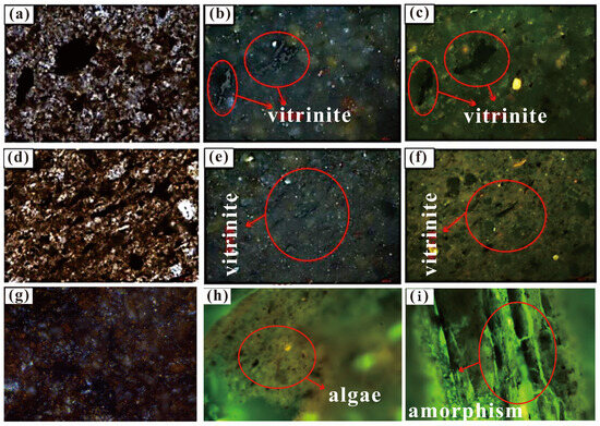 The overall Tmax values of P1-2q hydrocarbon source rocks are notably elevated, with the majority exceeding 490 °C or falling between 455 °C and 490 °C (Figure 9a). The kerogen exhibited a dark coloration, with minimal or no fluorescence observed from the vitrinite (Figure 12). It can be concluded that P1-2q hydrocarbon source rocks have reached a mature stage, with the organic matter having undergone a high level of evolution. The hydrocarbon-generating parent material of the P1-2q Formation muddy hydrocarbon source rock in the Well Qiatan-1 is algae and amorphism (Figure 9), and the type of organic matter is Type I. The microcomponents of P1-2q argillaceous hydrocarbon source rocks in Qimeigan section are only observable as vitrinite. The organic matter is derived from higher plants.