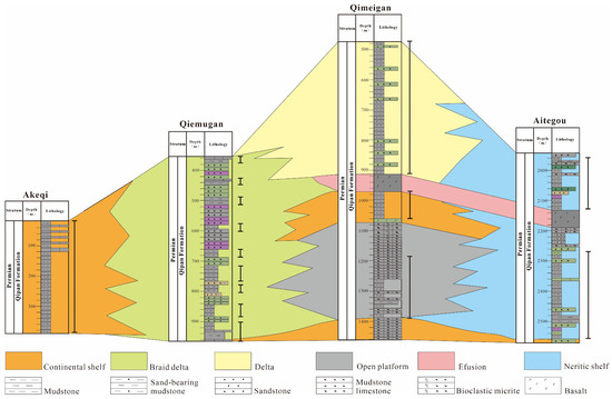 The Akeqi section is situated in Akeqi Village, Biaoertuokuoyi Township, Wuqia County. The exposed Permian strata of the profile are primarily of P1by, with a thickness of approximately 1947.67 m. The lithology is characterized by a gray purple conglomerate and gravelly bearing mudstone, with the upper part comprising gray, greenish gray, and dark gray mudstone (Figure 5k). The lithological characteristics and changes can be divided into three members. The third member can be correlated with the stratigraphy of P1-2q in the southwest depression, which is approximately 386.35 m thick. The main lithology is gray mudstone, with a minor component of gray bioclastic limestone (Figure 5l). The mudstone hydrocarbon source rock section is approximately 300 m thick, and the depositional environment is characterized by marine shelf sedimentary (Figure 8).
