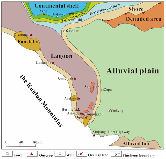Sedimentary facies map of Permian Qipan Formation in the piedmont southwestern Tarim Basin (adapted from [22]).