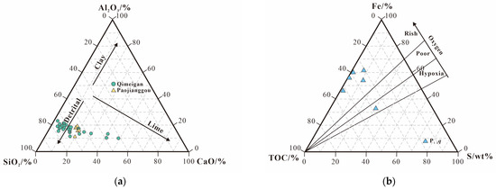 (a) The relative proportions of SiO2, Al2O3, and CaO were determined by triangulation. (b) The relative proportions of TOC, S, and Fe were determined by triangulation.
