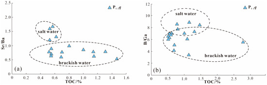 The TOC-S-Fe relationship indicates that the sedimentary waters of the hydrocarbon source rocks of P1-2q are predominantly slightly oxygen-rich, with a minor anoxic component (Figure 15b). The ratio of strontium to barium (Sr/Ba) and the ratio of boron to gallium (B/Ga) can be used to indicate the salinity of water bodies. The Sr/Ba values for the P1-2q hydrocarbon source rock samples from the Qimeigan section exhibit a range from 0.46 to 2, with a mean value of 0.91. Similarly, the B/Ga values range from 0.6 to 8.91, with a mean value of 5.42. The combined Sr/Ba and B/Ga salinity indexes [60,61] indicate that the salinity of the water bodies during the depositional period of the hydrocarbon source rocks of P1-2q was comparable and high for a semi-saline-brine environment (Figure 16).