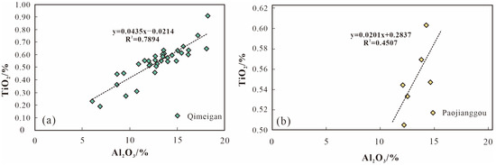 TiO2 and Al2O3 correlation indicator map. (a) P1-2q in Qimeigan section. (b) P1-2q in Paojianggou section.