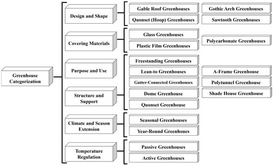 Greenhouses can be categorized based on various factors, including their design, construction materials, purpose, and functionality. Figure 1 demonstrates the main categorizations of greenhouses. These categorizations help differentiate greenhouses based on their specific features and applications, providing options for different climate conditions, crop requirements, and intended uses [1,2].