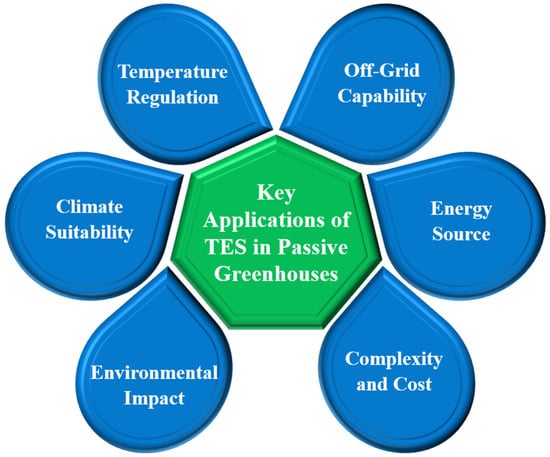 TES can be applied to various types of greenhouses to improve energy efficiency, optimize temperature regulation, and enhance overall sustainability. The following are some applications of TES in different greenhouse systems [8,9,10,11]: