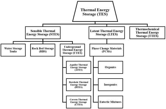 TES systems temporarily store thermal energy. These systems are crucial for energy grid integration, improving energy efficiency, and balancing the supply and demand of energy. Many types of TES systems exist based on how thermal energy is stored and released. The categorization of TES systems is demonstrated in Figure 4.