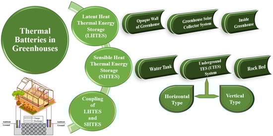 A viable way to improve agricultural operations’ sustainability and energy efficiency is to deploy TES devices as thermal batteries in greenhouses. By preserving ideal growth conditions, TES systems can lower interior temperature fluctuations, decrease the need for heating and cooling, and increase crop yields. By reducing the dependency on fossil fuels, integrating TES with renewable energy sources even further improves its environmental advantages. To fully realize the promise of TES in greenhouse applications, future research should concentrate on refining TES materials, enhancing system designs, and evaluating the long-term environmental and economic effects. In this review work, various dimensions and methods of using TES systems inside greenhouses have been examined, and the achievements of previous related works have been evaluated: