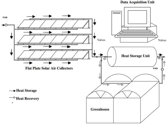 Vadiee et al. [9] employed TRNSYS to create a theoretical model for energy analysis. They provided a qualitative study of the economics of a TES-equipped closed greenhouse. The peak load was controlled by a PCM or SCW daily storage system, while a BTES system handled seasonal storage. The primary function of BTES is to retain low-temperature heat; hence, a heat pump is needed to supply heat at the right temperature. The idea behind seasonal storage is to optimize solar energy utilization. Thus, seasonal and/or daily TES methods must be employed to collect and store excess sensible and latent heat. Later, this extra heat can be used to meet the greenhouse’s thermal load. Seasonal storage is the most common application for UTES. To meet daily demands and peak loads, a short-term storage system such as PCM storage or stratified chilled water (SCW) storage may be employed. The findings of the economic feasibility evaluation suggested that the concept has the potential to become cost-effective. Given the seasonal TES systems, the significant investment in the closed greenhouse idea might be repaid in 7–8 years from savings on supplemental fossil fuel. However, if the base load is used as the design load rather than the peak load, the payback time can be decreased to 5 years. In this instance, a short-term TES is required to cover the hourly peak demands. The schematics of the proposed system by Vadiee et al. [9] are shown in Figure 36.