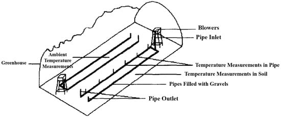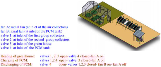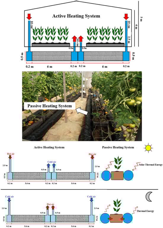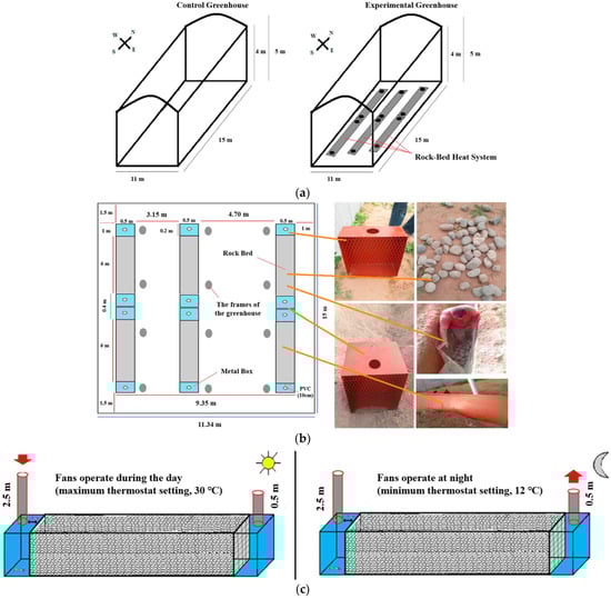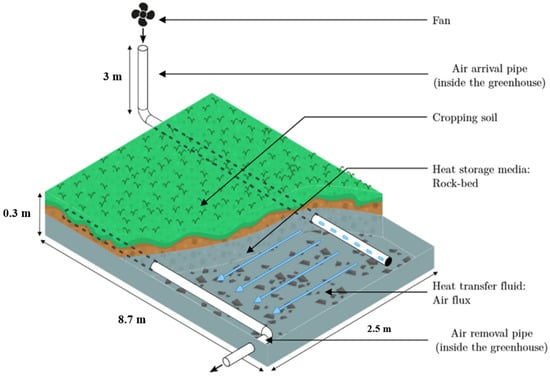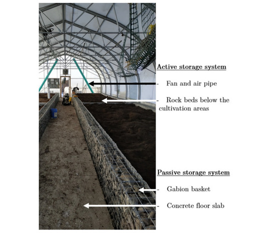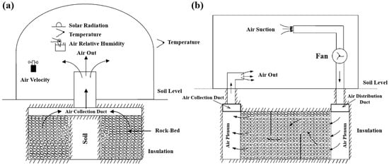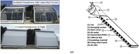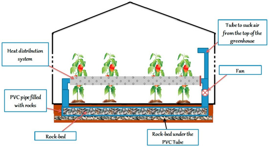- Bouhdjar et al. [48] first presented the most efficient greenhouse–rock bed coupled system design in 1996, in which the humid air injection/suction mechanism was utilized for charging/discharging modes. Other researchers later used this method. However, no detailed analysis has yet been conducted to optimize its performance.