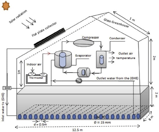 - Awani, S.; Kooli, S.; Chargui, R.; Guizani, A. Numerical and experimental study of a closed loop for ground heat exchanger coupled with heat pump system and a solar collector for heating a glass greenhouse in north of Tunisia. Int. J. Refrig. 2017, 76, 328–341. [Google Scholar] [CrossRef]