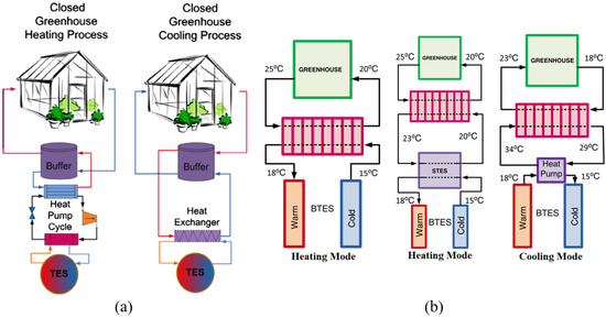 (a) The conceptual aspects of a closed greenhouse in heating and cooling modes (without considering the heat pump cycle) and (b) various layouts of the proposed TES systems in the proposed greenhouse by Vadiee et al. [9].