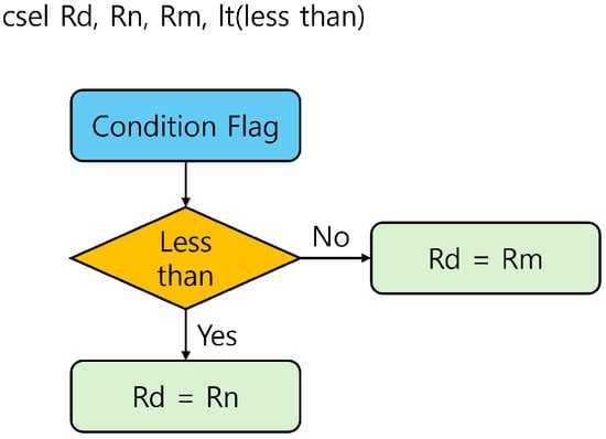 Process of ’csel’ instruction operation with less than condition in ARMv8: This diagram illustrates how the ’csel’ instruction operates when the condition is ’less than’. Based on the condition flag, if the result is true (less than), is set to , otherwise it is set to .