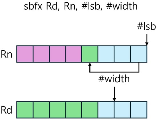 Next, as shown in Figure 2, The ’sbfx’ instruction copies a specific range of bits from a source register to a destination register, while sign-extending the highest bit in the specified range into the higher bits that are not included in the copied range. Here, ’#lsb’ refers to the starting point of the copied range, and ’#width’ denotes the length of the range.