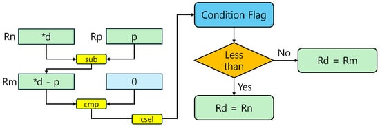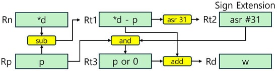 When it is a positive number, the value obtained by subtracting the decimal p value is the result of w. In the case of a negative number, p is added again, so *d is the result. In other words, when it is a negative number, subtracting and adding p is not a necessary operation. Because the first value of w(w = *d − p) can be obtained to know whether it is a positive or negative number, it is difficult to omit the operation of subtracting p. However, in the case of addition operations, it can be omitted if it is known whether the value(w = *d − p) is positive or negative. Therefore, in this paper, we propose an efficient implementation that uses the ‘csel’ instruction to omit the addition operation and omits tbmask to calculate w with fewer instructions.